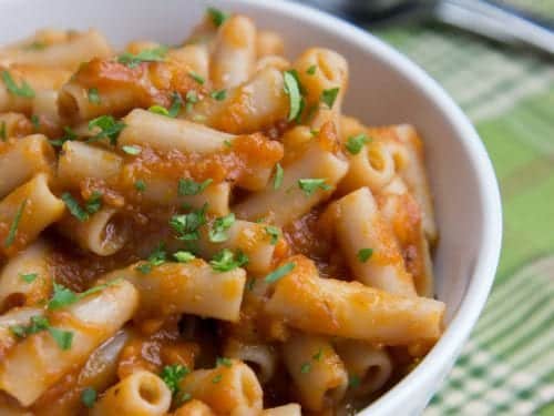 This pasta recipe is tossed in a butternut squash marinara sauce and is a great use of roasted butternut squash.