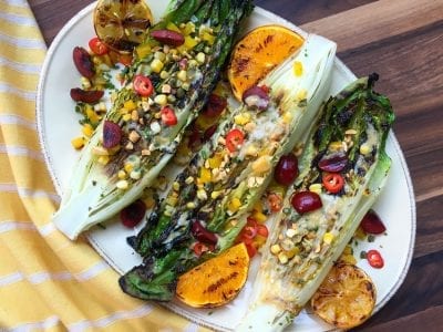 Grilled romaine salad recipe with fresh cherries and a creamy tahini dressing.