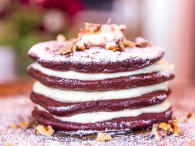 To make the short stack alternate pancakes with layers of frosting and garnish with toasted walnuts and a spanking of powdered sugar.