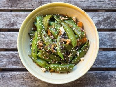 Add the red onion and next 2 ingredients and cook for 1 more minute. Lower the heat to low and add the sesame oil and next 5 ingredients. Check for seasoning and serve. You might need more tamari/soy sauce and vinegar. You want the peas to be acidic and salty. Don't overcook the peas, you want them to still have a nice crunch.